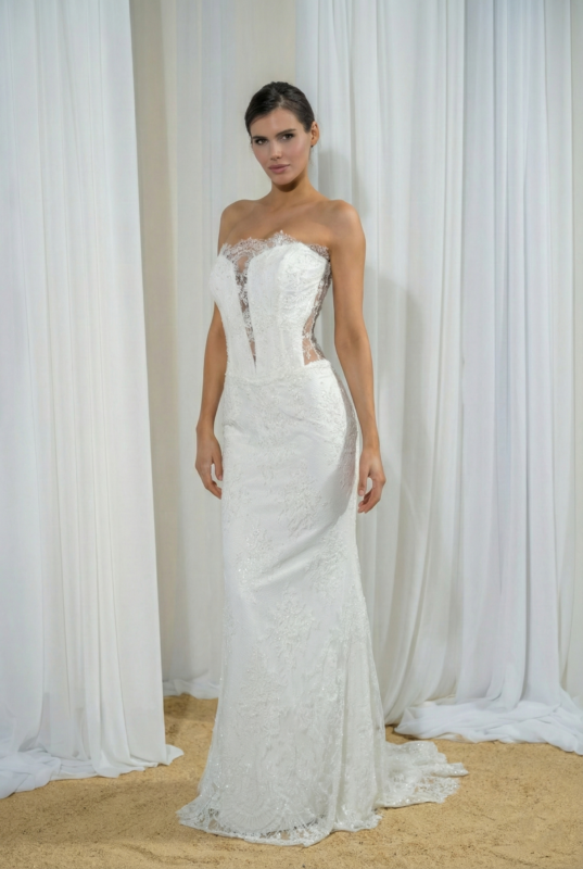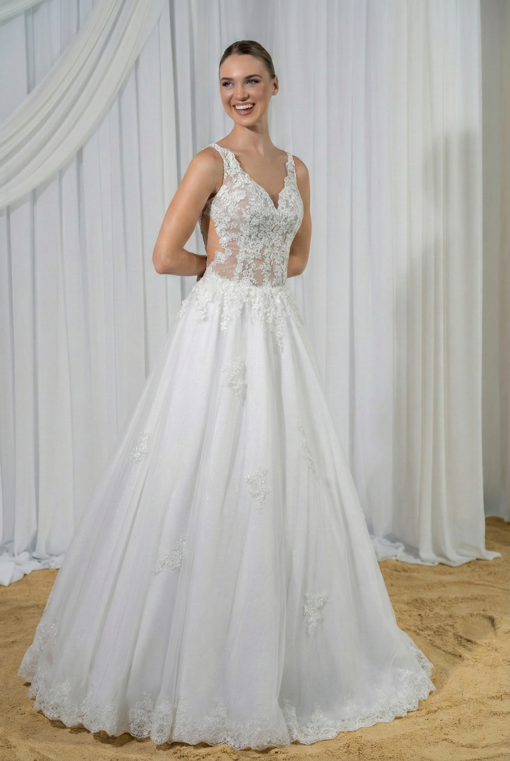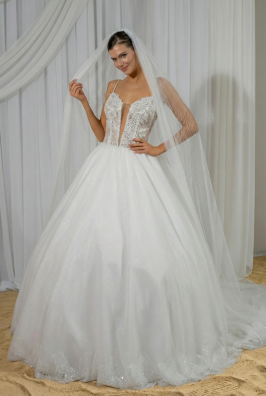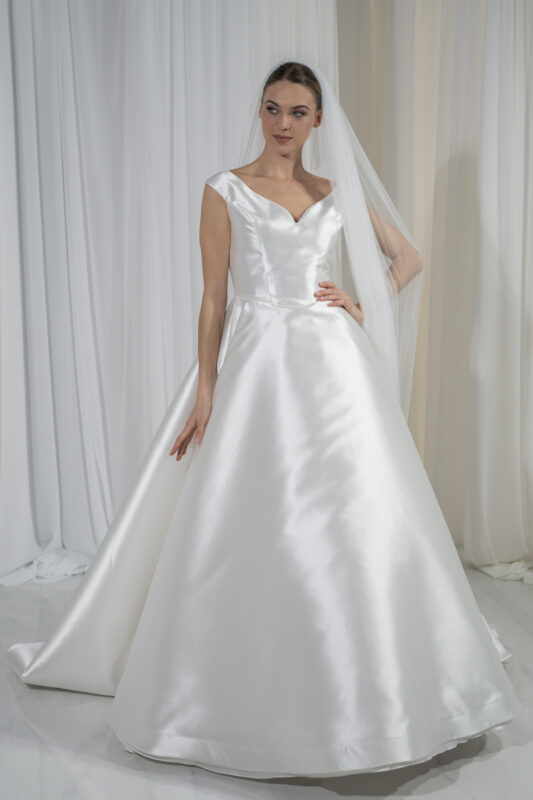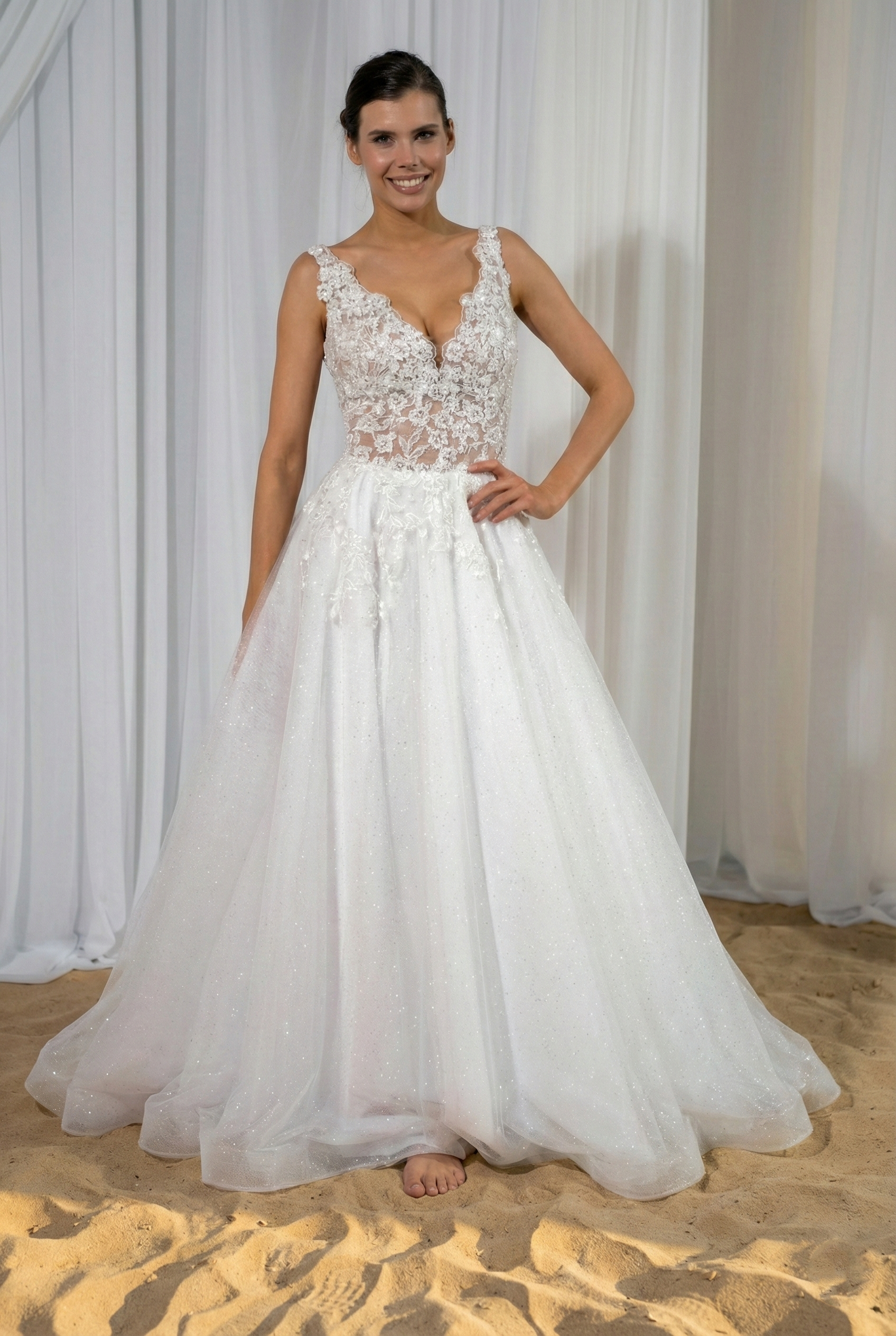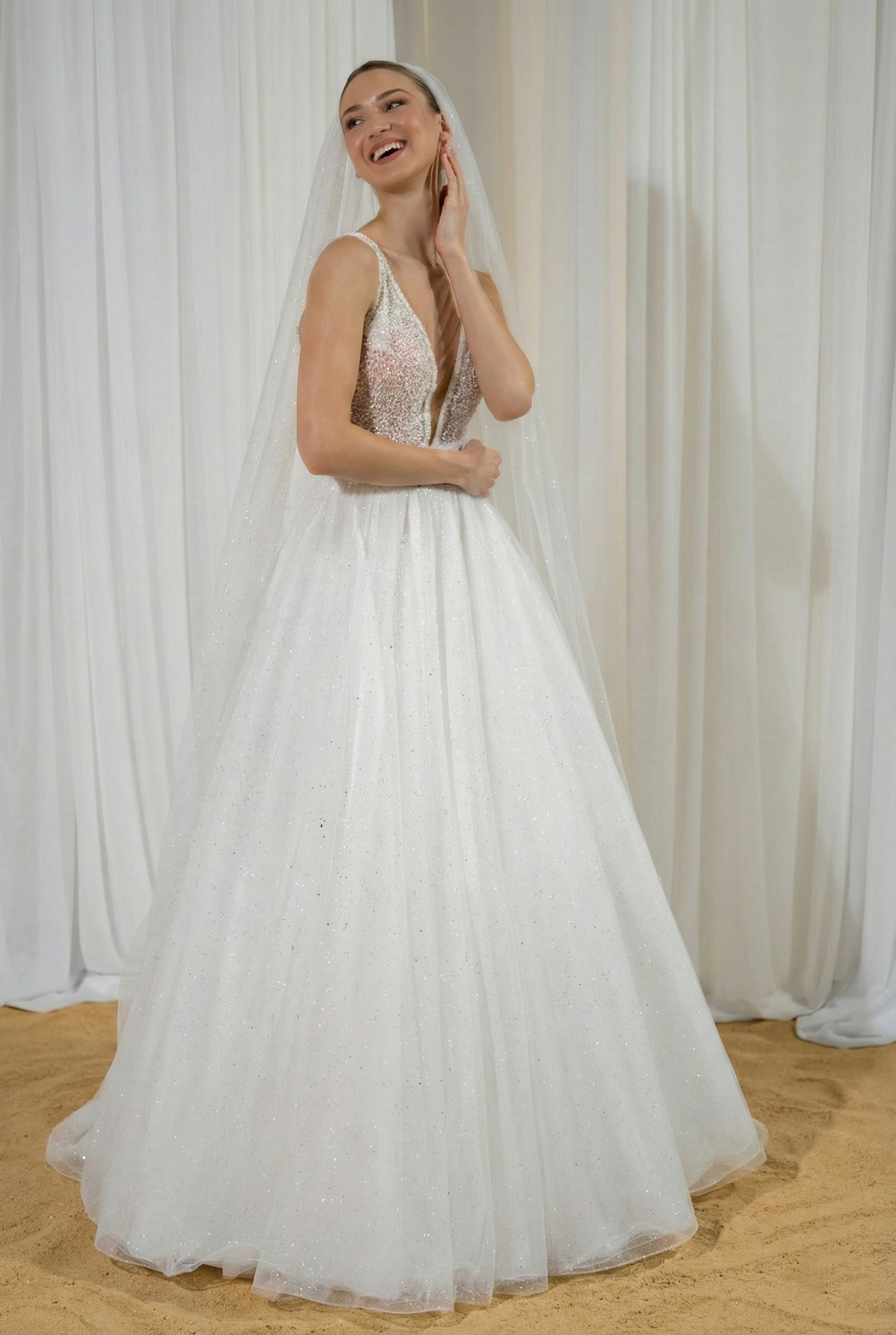 Η λαιμόκοψη V αναδεικνύει και κολακεύει ιδιαίτερα το γυναικείο ντεκολτέ. Στο συγκεκριμένο σχέδιο, το ύφασμα που βρίσκεται στο πάνω μέρος του νυφικού, σχηματίζει το γράμμα V, προσθέτοντας βάθος στο μπούστο.